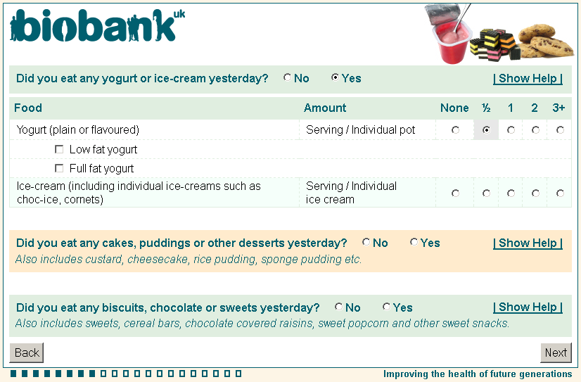 Online diet questionnaire screenshot wd0018, showing appearance as seen by participants using a web browser circa 2011.