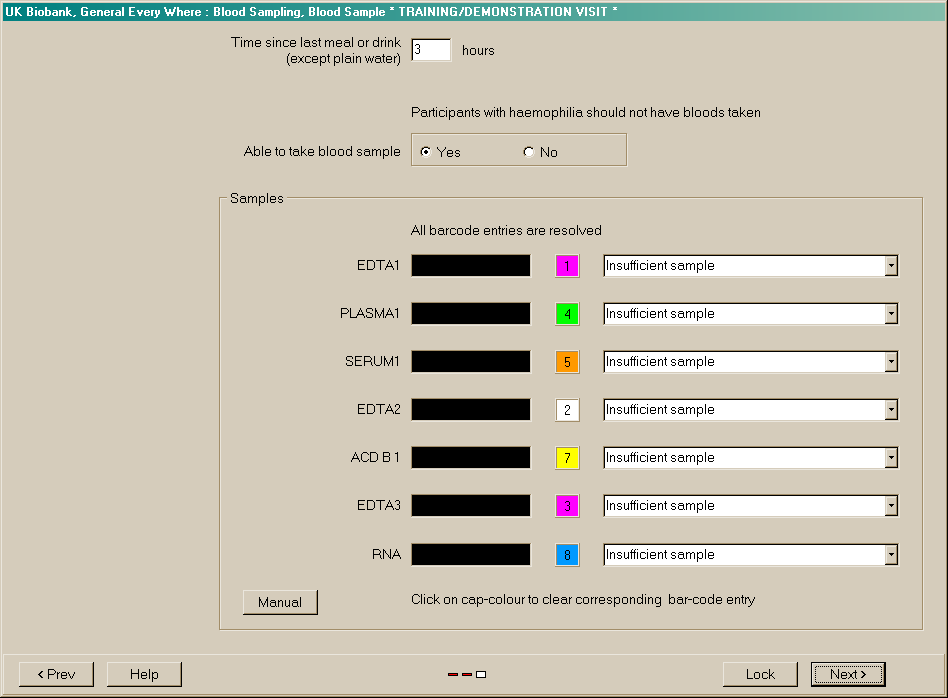 Screenshot after blood sample collection, demonstration shows all samples marked as uncollected