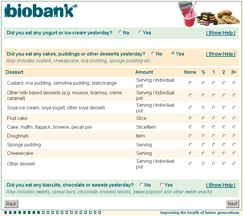 Online diet questionnaire screenshot wd0096, showing appearance as seen by participants using a web browser circa 2011.