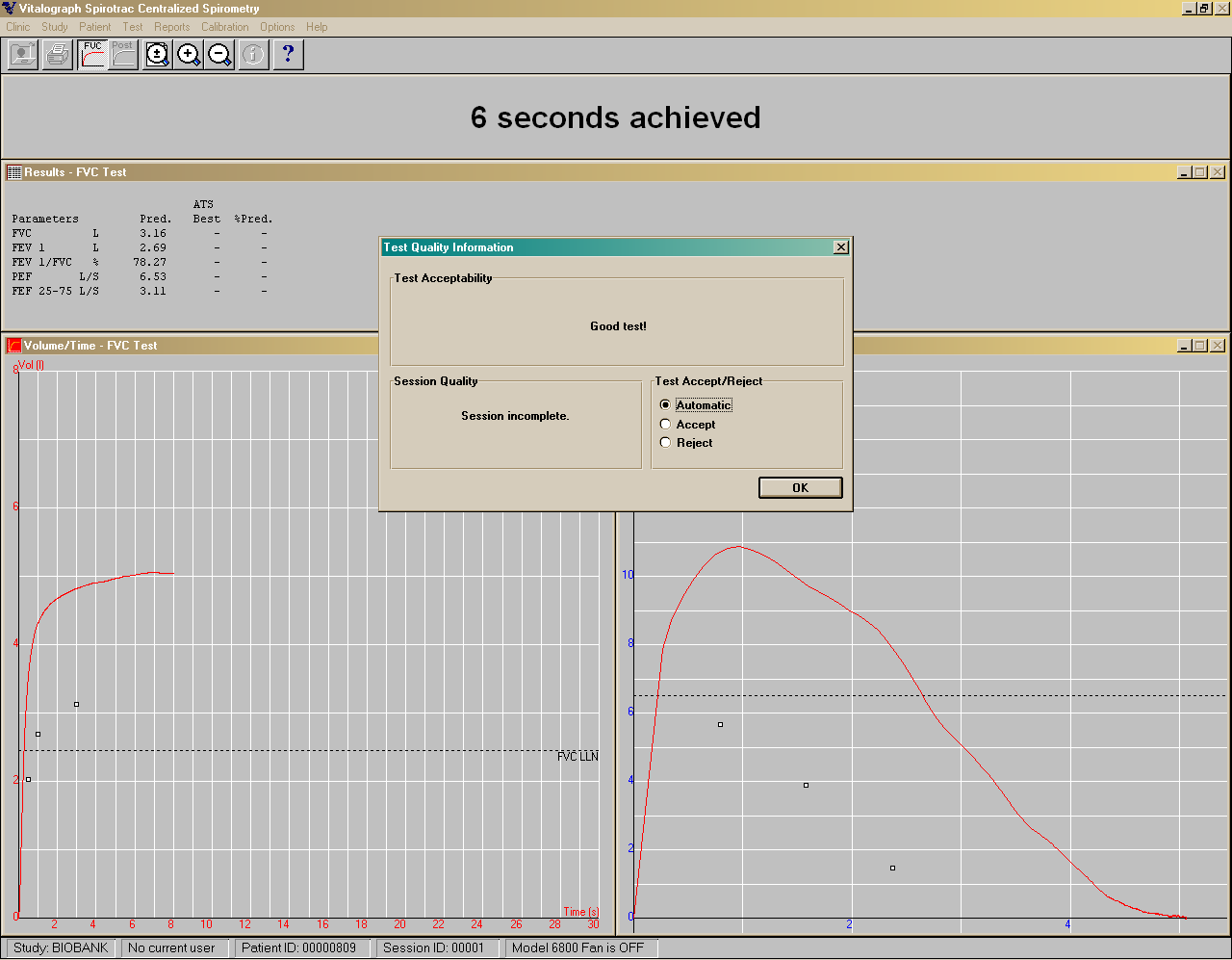 Screenshot of Vitalograph spirometry software displaying results for user acceptance