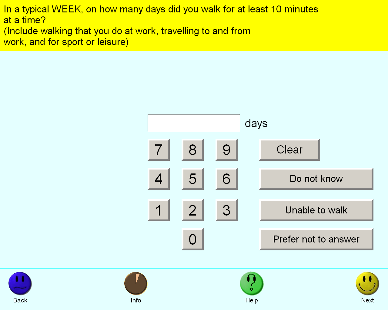 Screenshot of touchscreen questionnaire used to capture field 864 in the UK Biobank Assessment Centres using the ACE system.