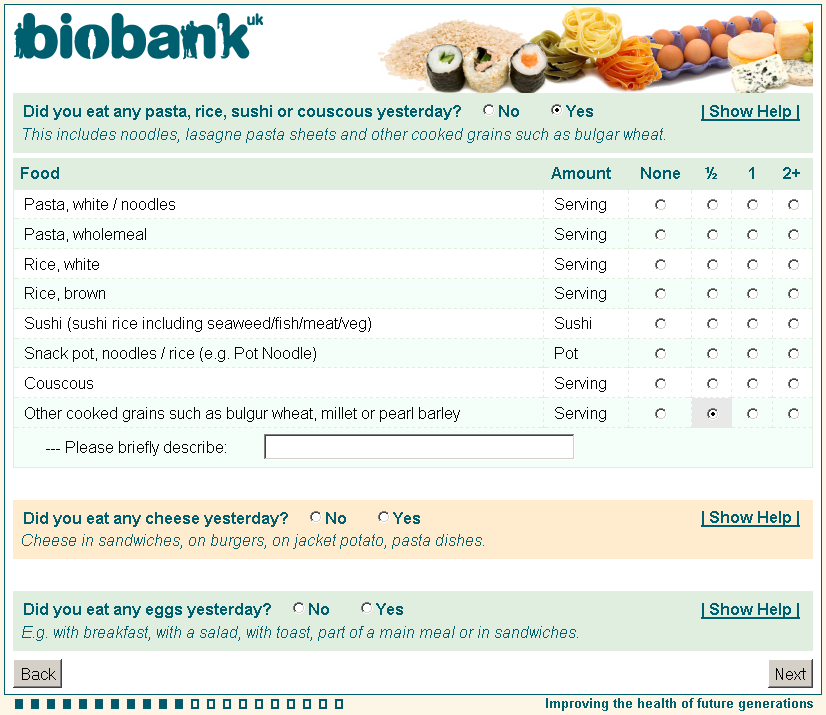 Online diet questionnaire screenshot wd0027, showing appearance as seen by participants using a web browser circa 2011.