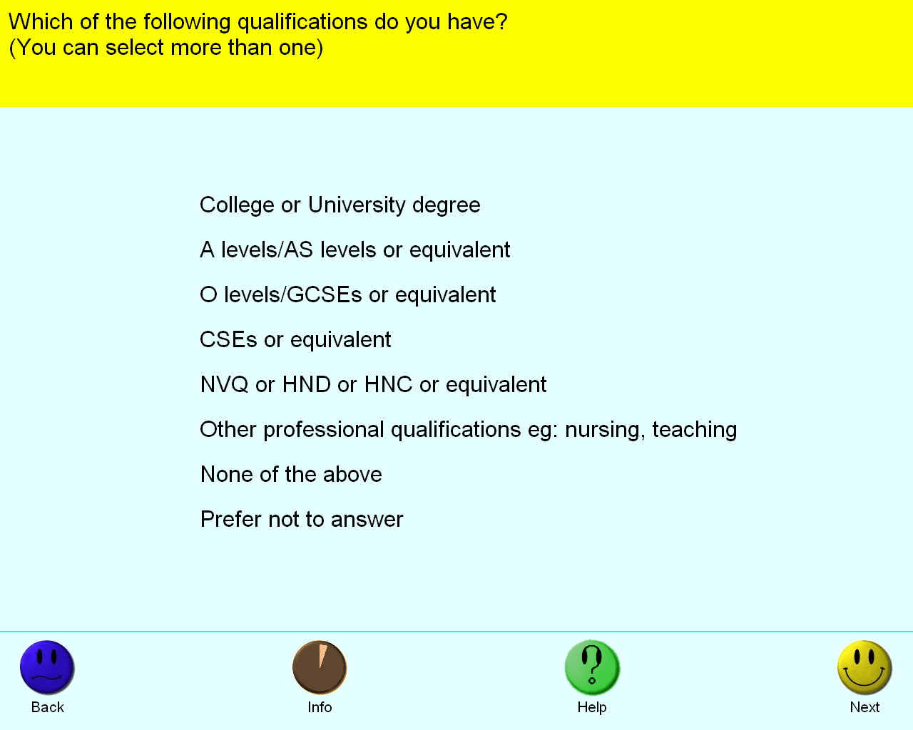 Screenshot of touchscreen questionnaire used to capture field 6138 in the UK Biobank Assessment Centres using the ACE system.