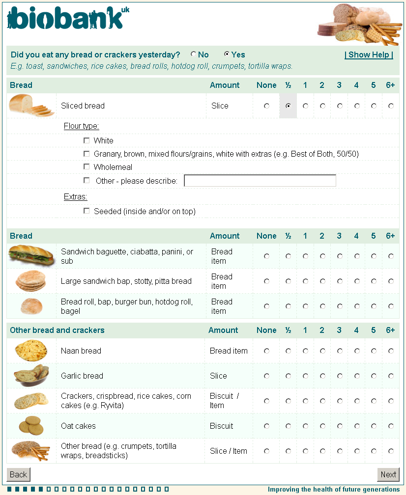 Online diet questionnaire screenshot wd0014, showing appearance as seen by participants using a web browser circa 2011.