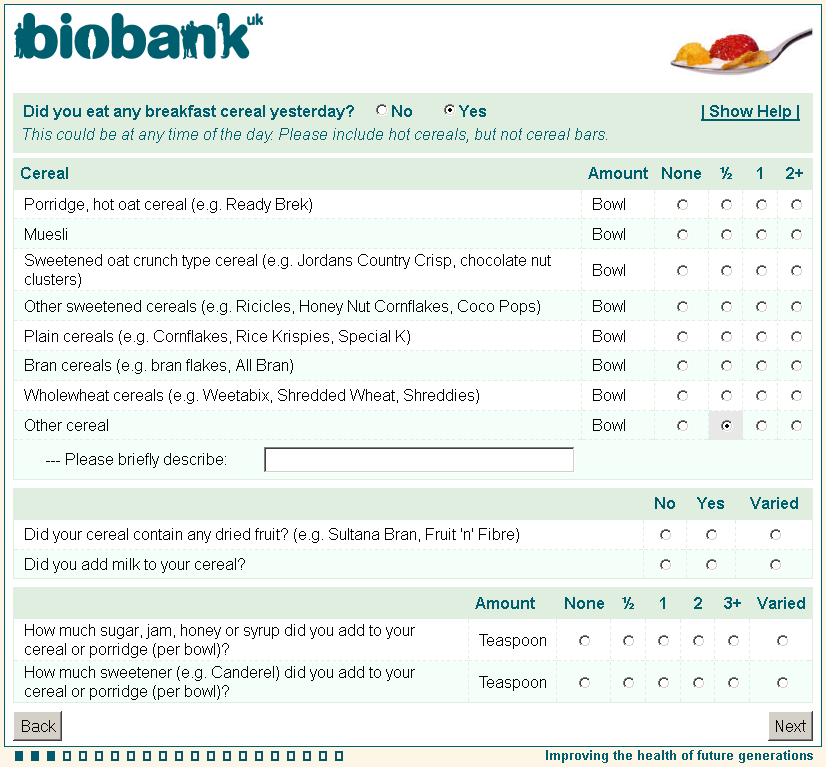 Online diet questionnaire screenshot wd0069, showing appearance as seen by participants using a web browser circa 2011.