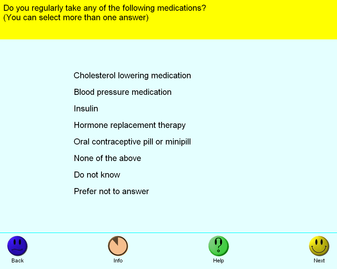 Screenshot of touchscreen questionnaire used to capture field 6153 in the UK Biobank Assessment Centres using the ACE system.