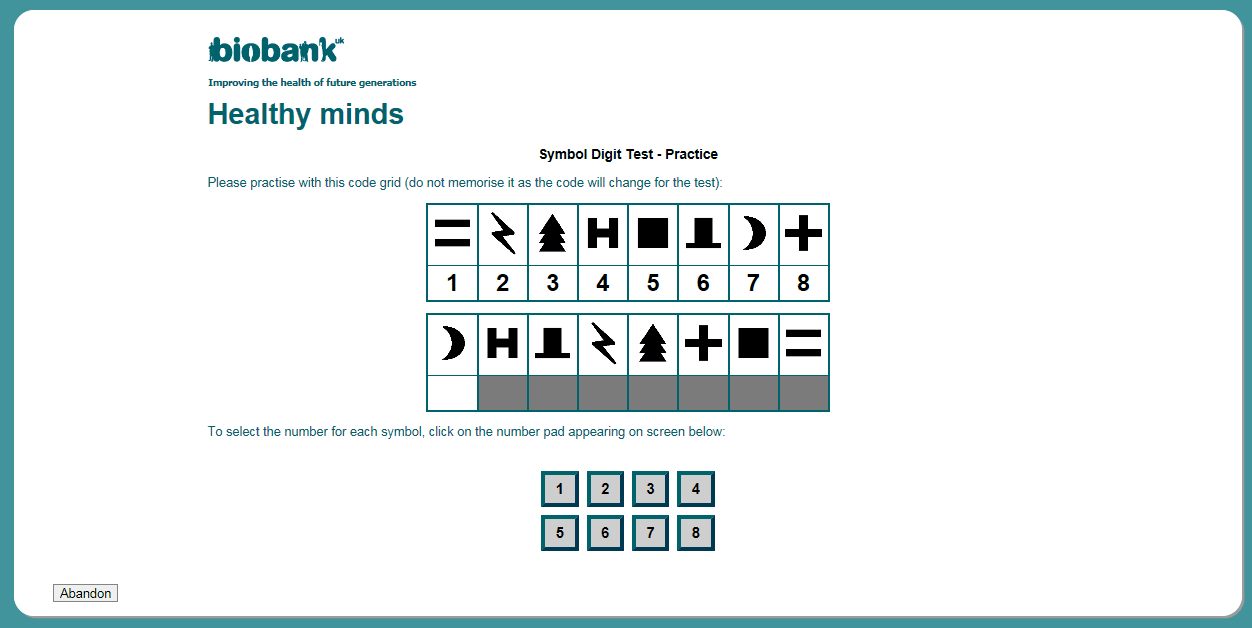 Participants were presented with this screen to allow them to practise the symbol digit test before the live timed segment began.