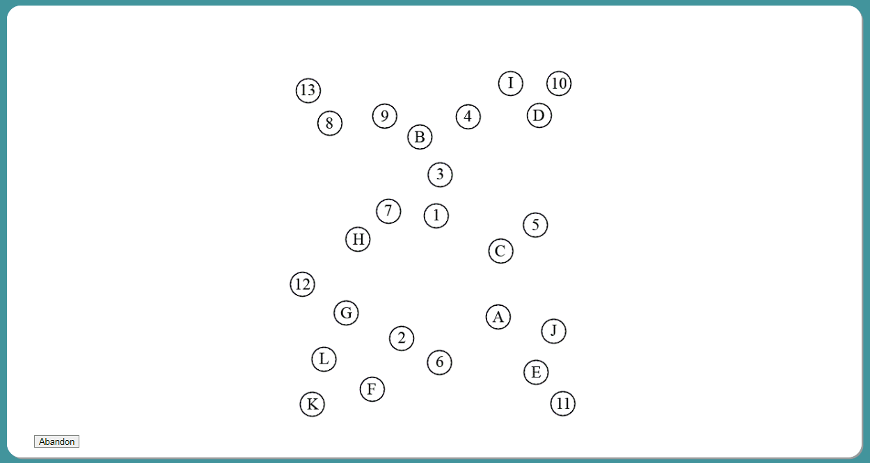 This is the screen presented to participants as the second trail making test in the online (i.e. web-based) implementation. The touchscreen implementation used the same text and layout of the trail circles but had a different border. Version shown is from 2014 implementation.