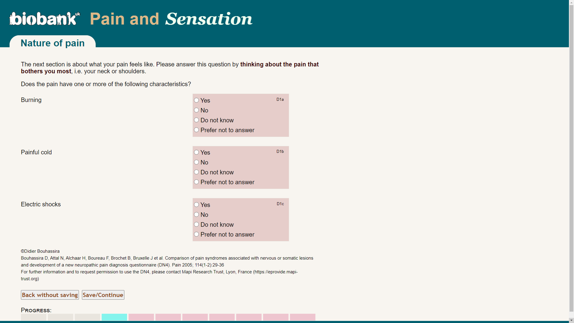 Online pain questionnaire screenshot of questions D1a -D1c, showing appearance as seen by participants circa 2019.