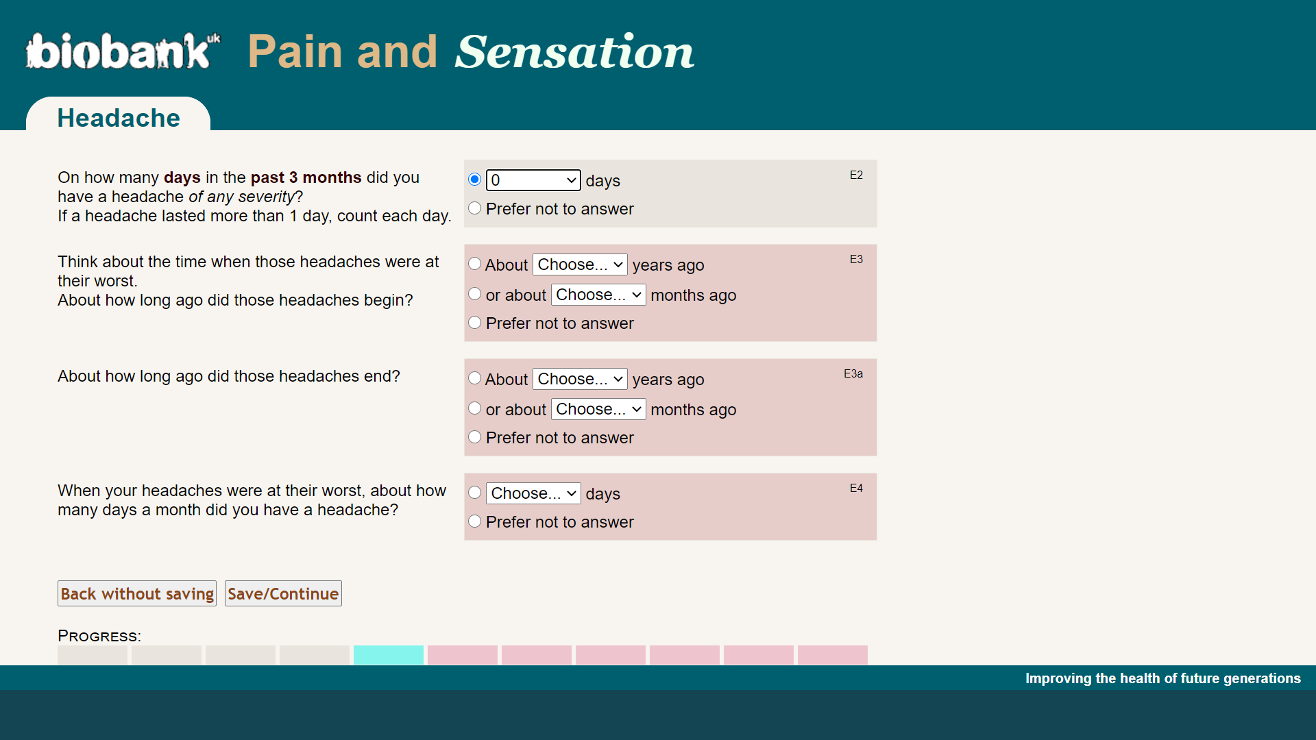 Online pain questionnaire screenshot of question E3a, showing appearance as seen by participants circa 2019.