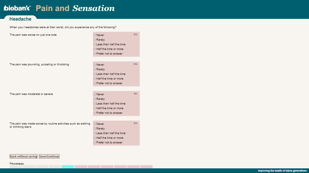 Online pain questionnaire screenshot of questions E5a-E5d, showing appearance as seen by participants circa 2019.