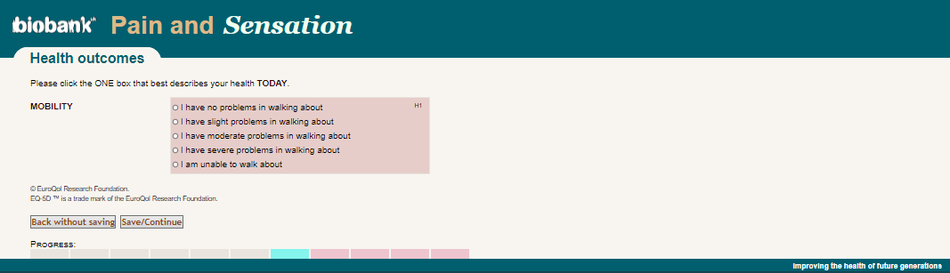 Online pain questionnaire screenshot of question H1, showing appearance as seen by participants circa 2019.