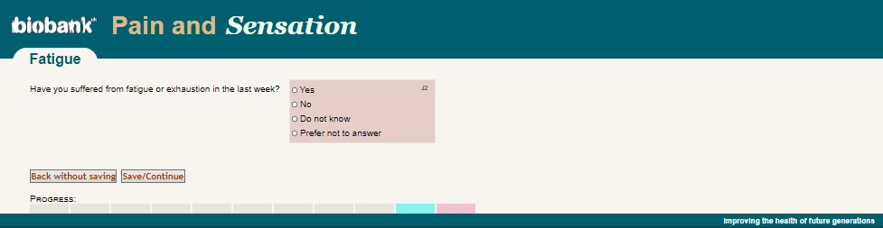 Online pain questionnaire screenshot of question J2, showing appearance as seen by participants circa 2019.