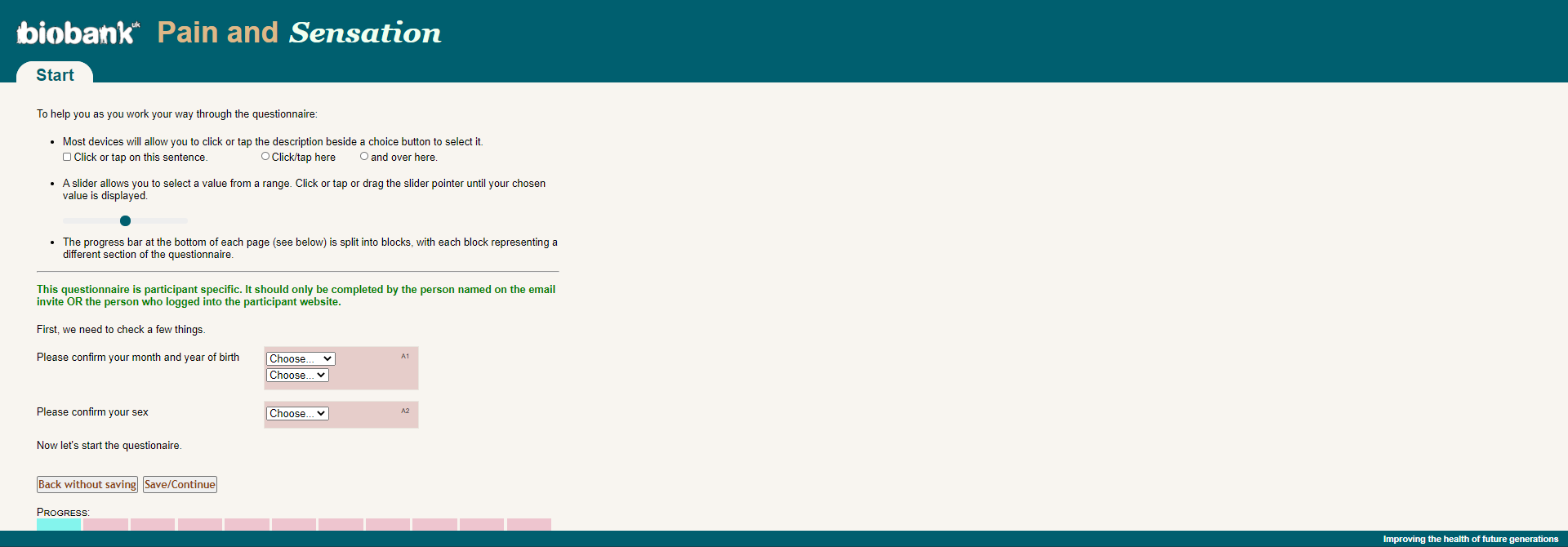 Online pain questionnaire screenshot of start page, showing appearance as seen by participants circa 2019.