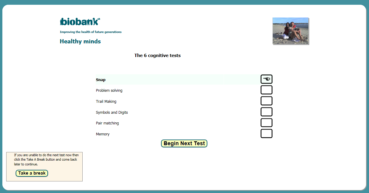 Screenshot from 2014 version. After the initial questions this screen was used to allow participants to see their progress and, optionally, take a break from the questionnaire. Participants who opted to take a break could resume the tests by re-authenticating themselves.