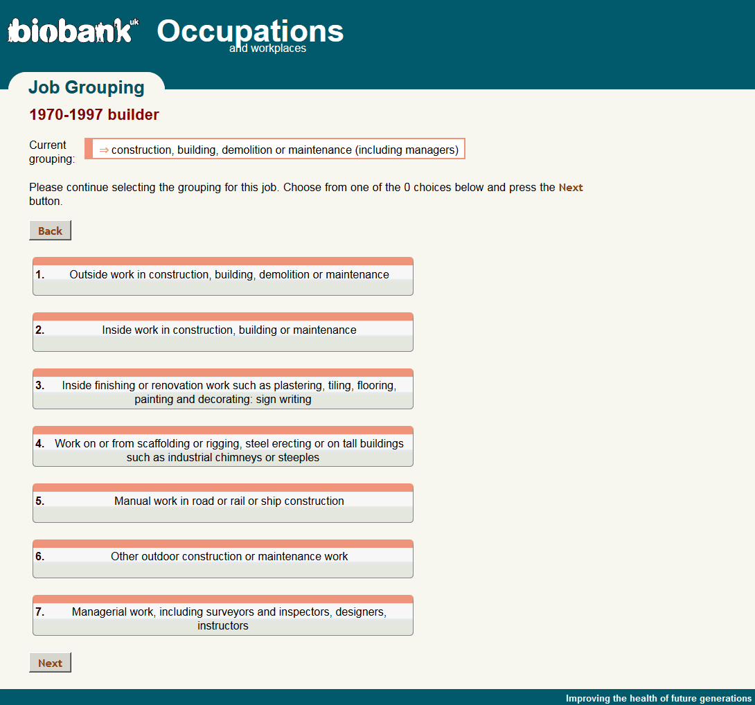Web screenshot from Occupational questionnaire showing intermediate screen used by participants to self-code a job.
