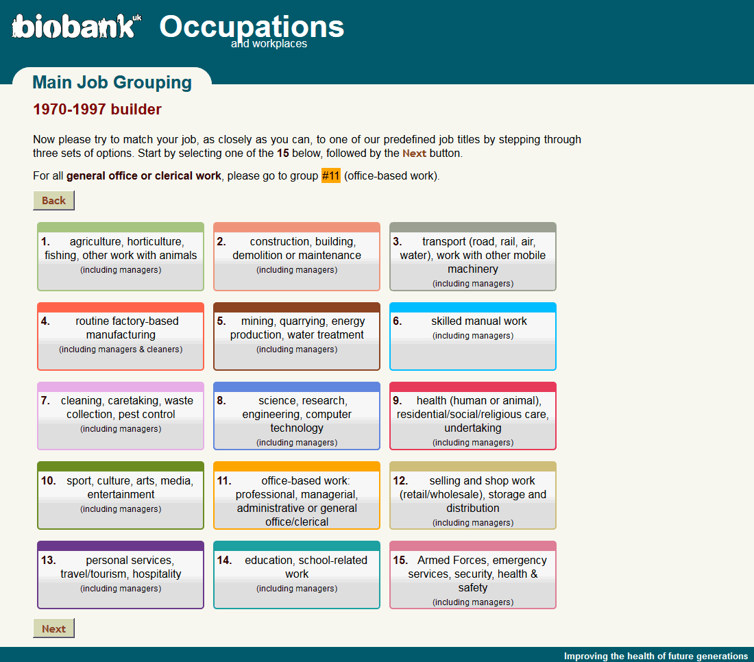 Web screenshot from Occupational questionnaire showing initial/upper screen used by participants to self-code a job.