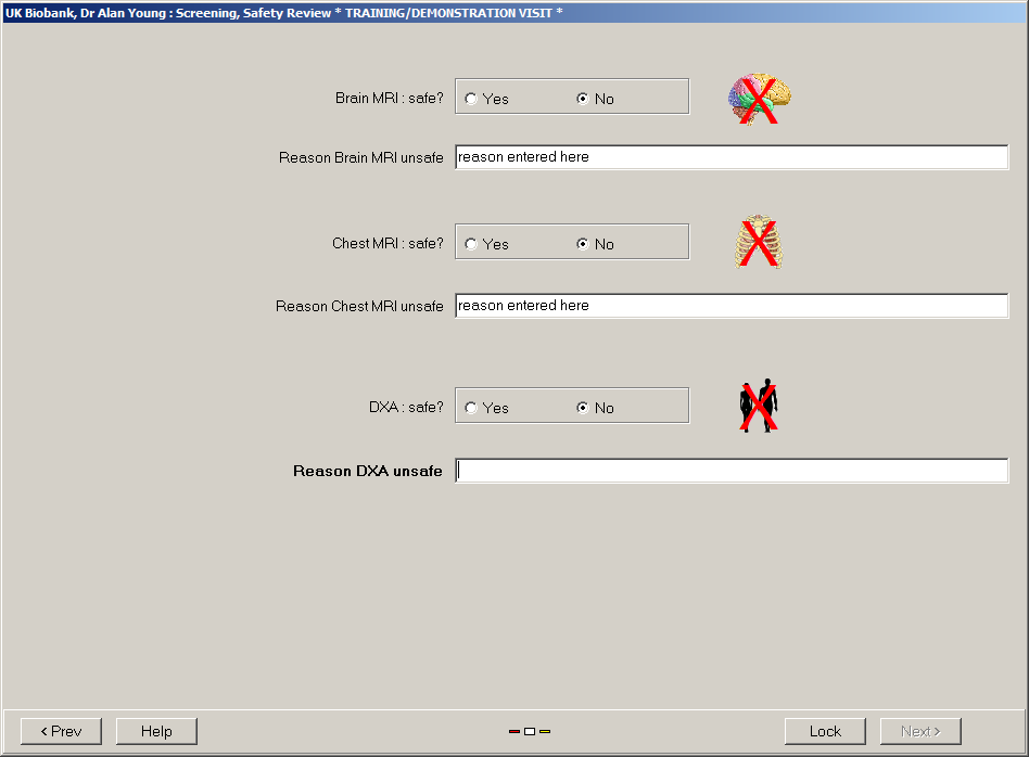 If the interview determined it was unsafe for a participant to go through some or all of the imaging stations (MRI and DXA) then they indicated the reasons using the boxes that appear when they flag a station as unsafe.