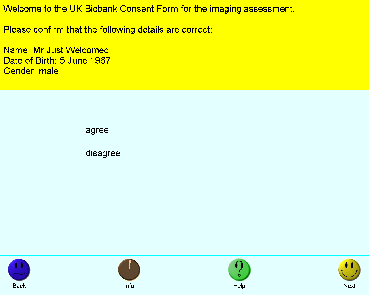 The second screen of the imaging consent process displayed the participants identifying information and required them to confirm it is correct before proceeding. If the participant indicated some or all of the information is incorrect then a staff member would be summoned to assist.