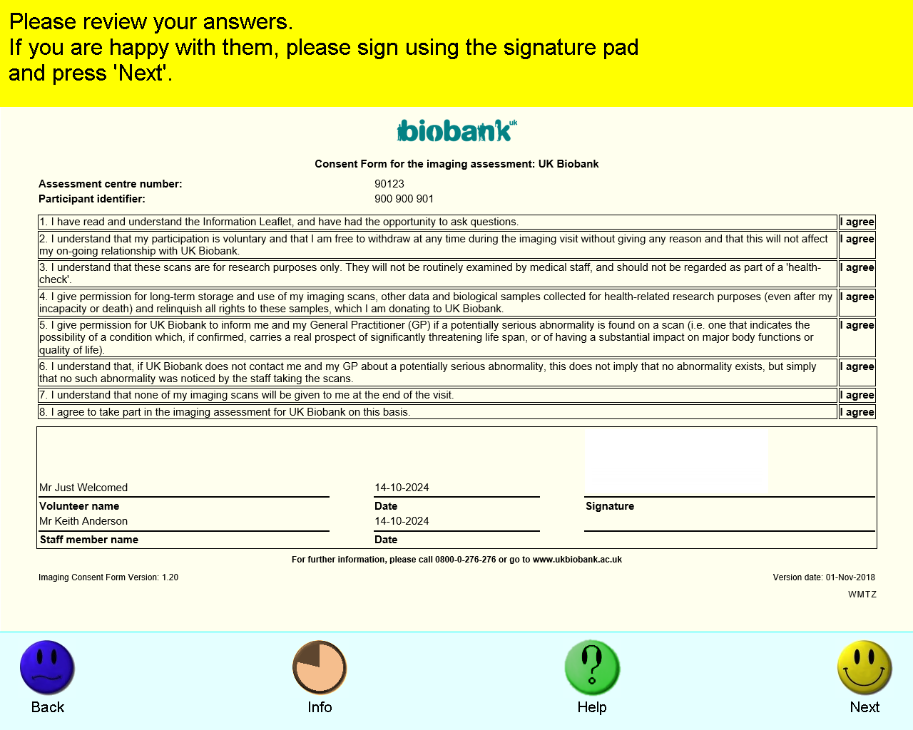 After answering the eight imaging consent question positively the participant is shown a draft of their consent form and invited to add their signature.