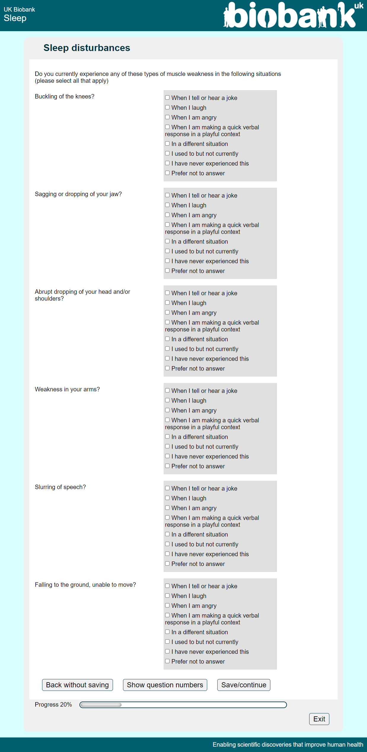 Online sleep questionnaire screenshot Nar1a-Nar1f, showing appearance as seen by participants circa 2022
