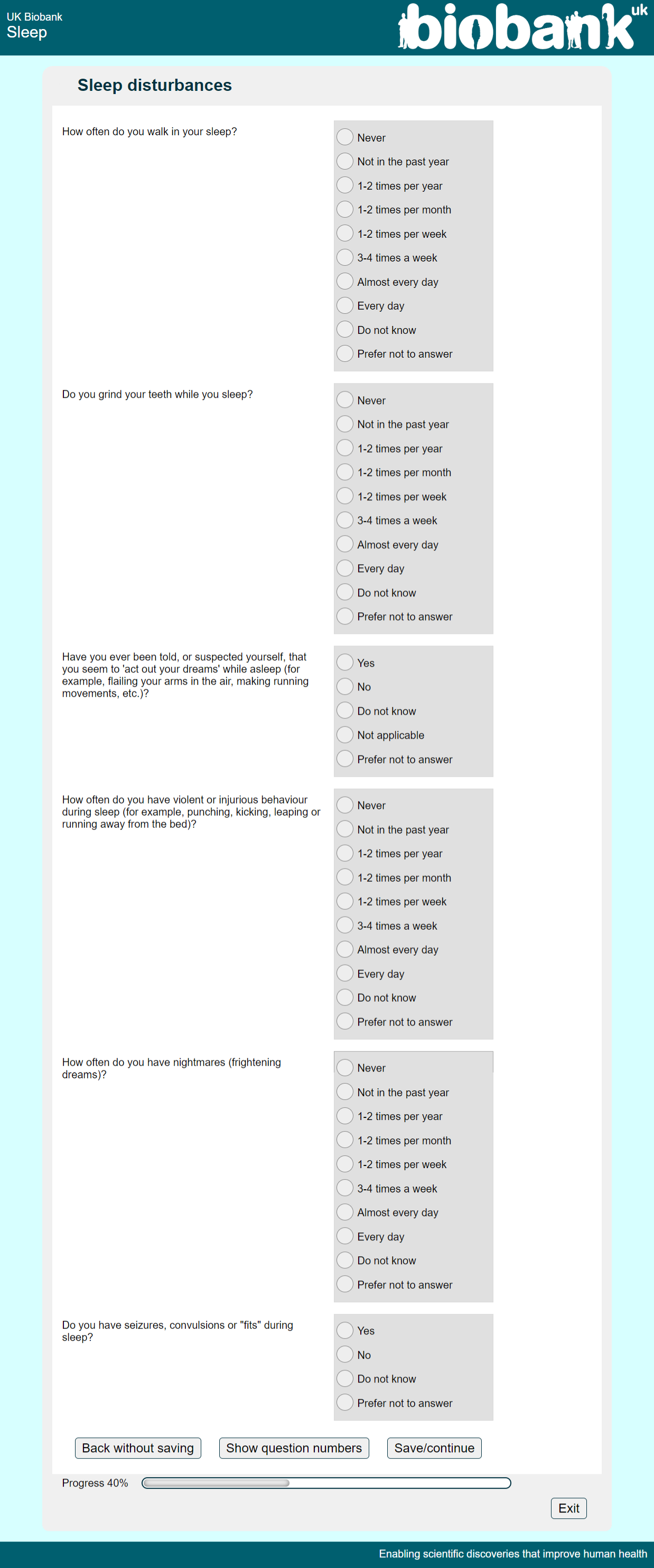 Online sleep questionnaire screenshot Para1-Para6, showing appearance as seen by participants circa 2022