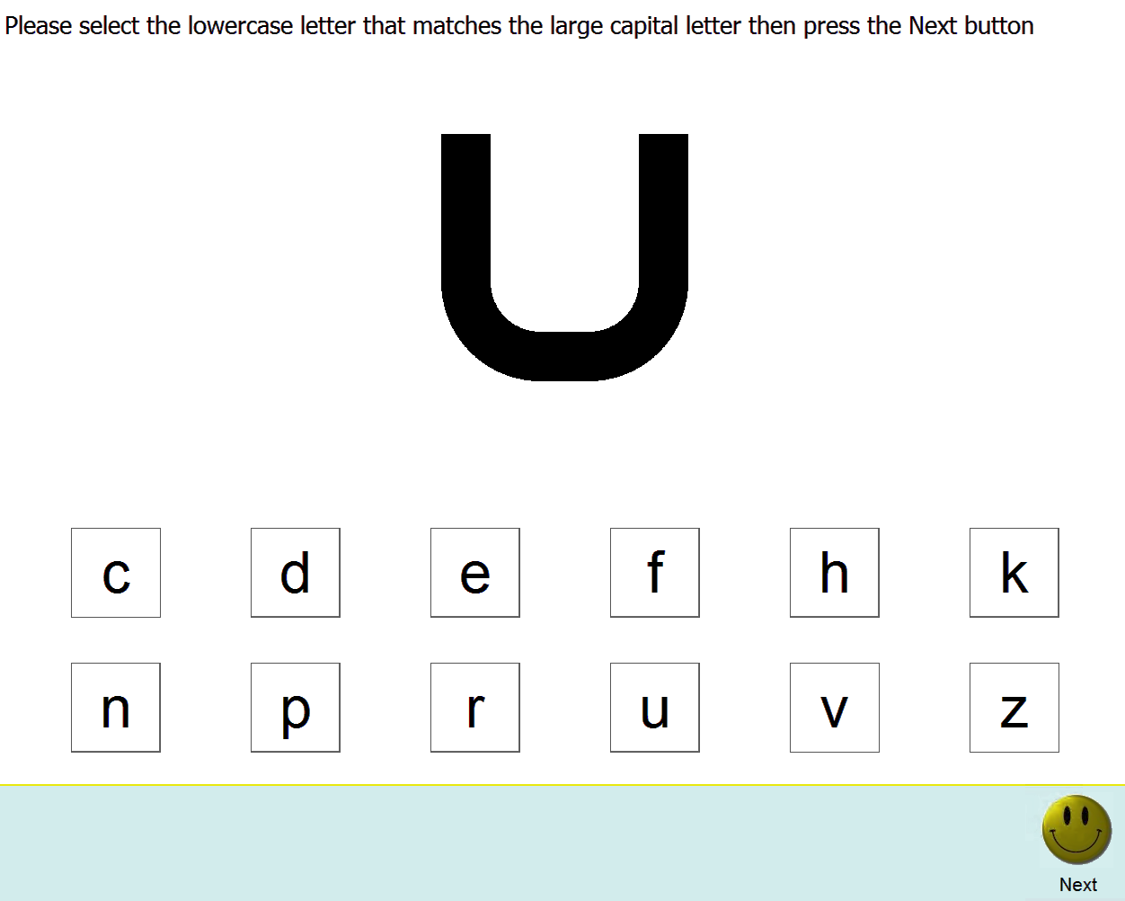 Example of first screen displayed after test instructions, showing a fully complete letter U with reminder instruction at top of screen.