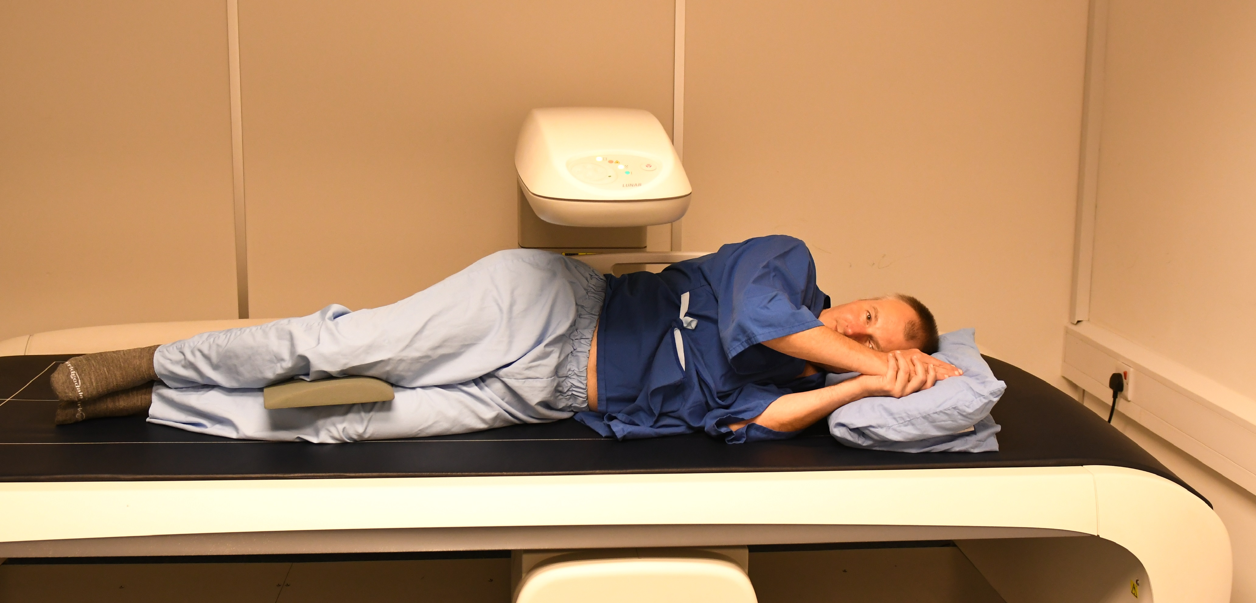 A participant is shown lying on their side ready for the spine DXA scan to begin.