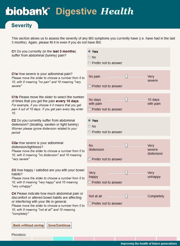 Online digestive health screenshot of questions C1a-b and C2a-b with supplementary scales expanded, showing appearance as seen by participants using a large-screen web-browser circa 2017.