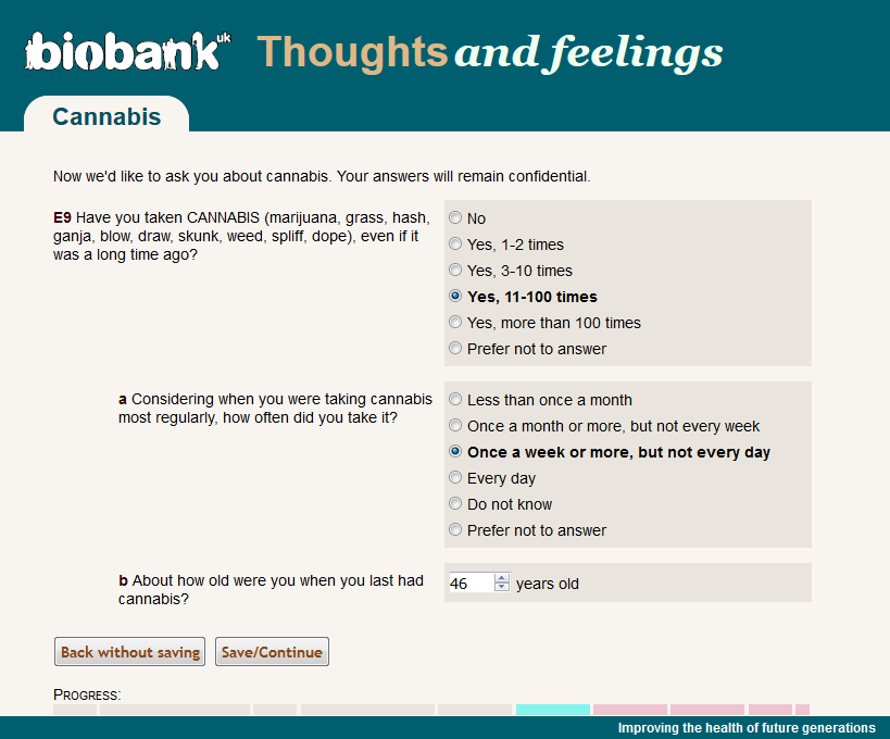 Screenshot of web-page for cannabis use from the UK Biobank on-line "Thoughts and Feelings" mental health questionnaire