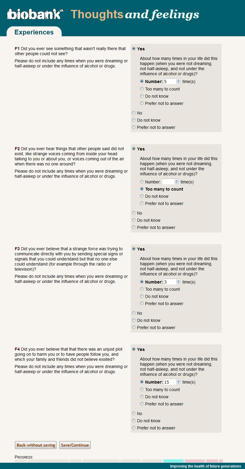 Screenshot of web-page for types of unusual experiences from the UK Biobank on-line "Thoughts and Feelings" mental health questionnaire