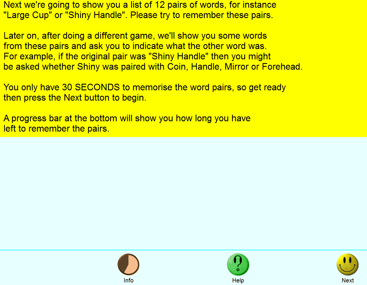 This screen introduced the paired associate learning test to the participant and primed them to remember the 12 sets of words (listed in Resource 6551).
