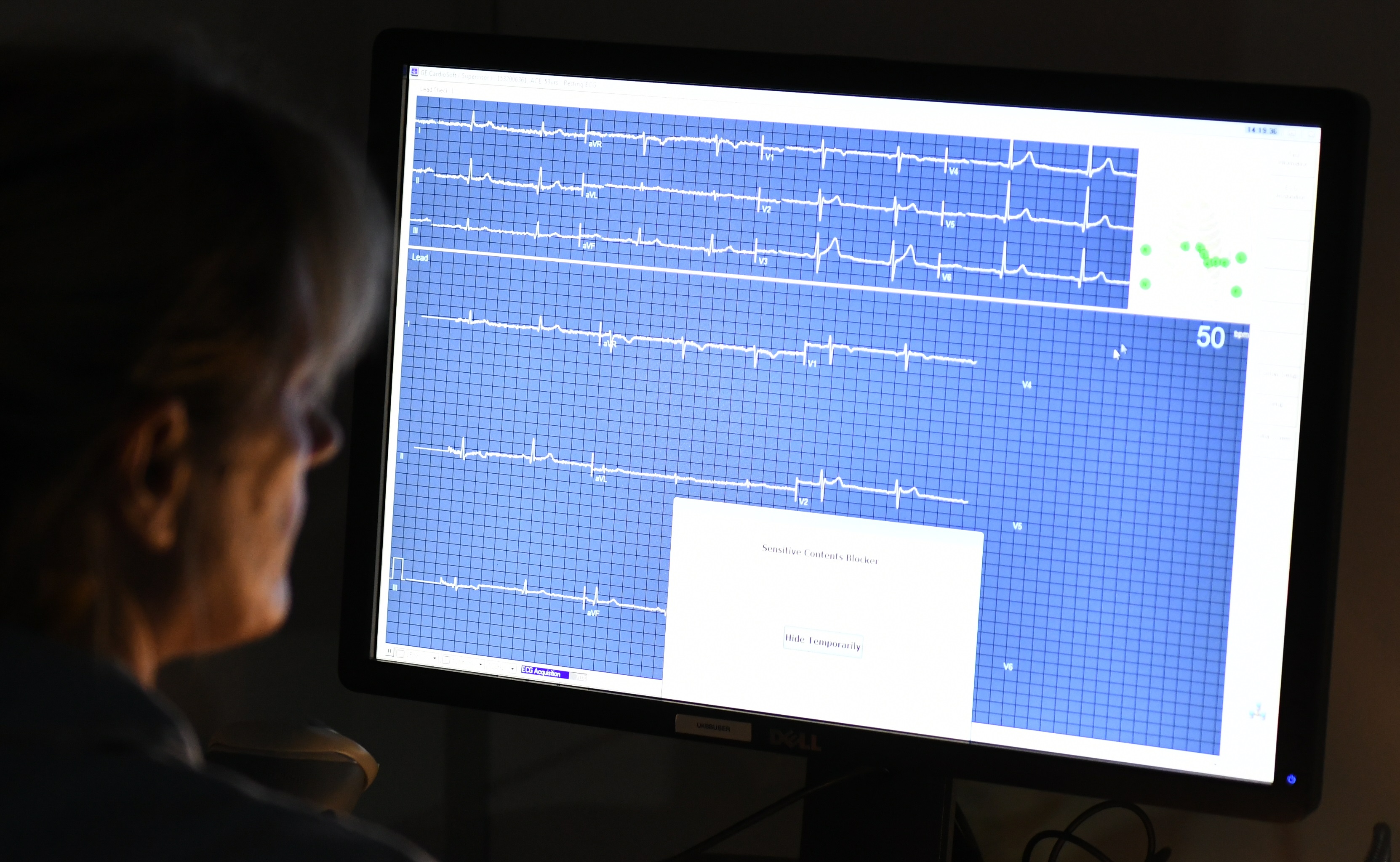 Screenshot of system during performance of 12-lead ECG measurement. Note the privacy shield pop-up in the lower centre of screen which obscures the participants identifying information from staff view.