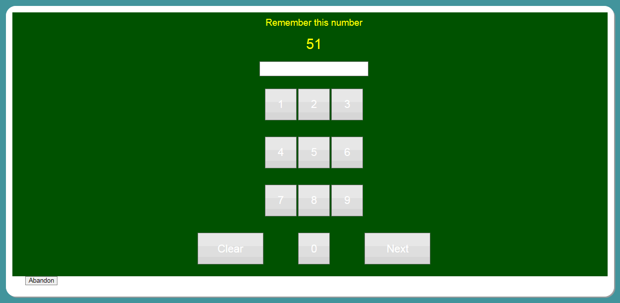This is the web numeric response screen. The picture illustrates the screen when the user is being shown a number to remember and the controls below are disabled.