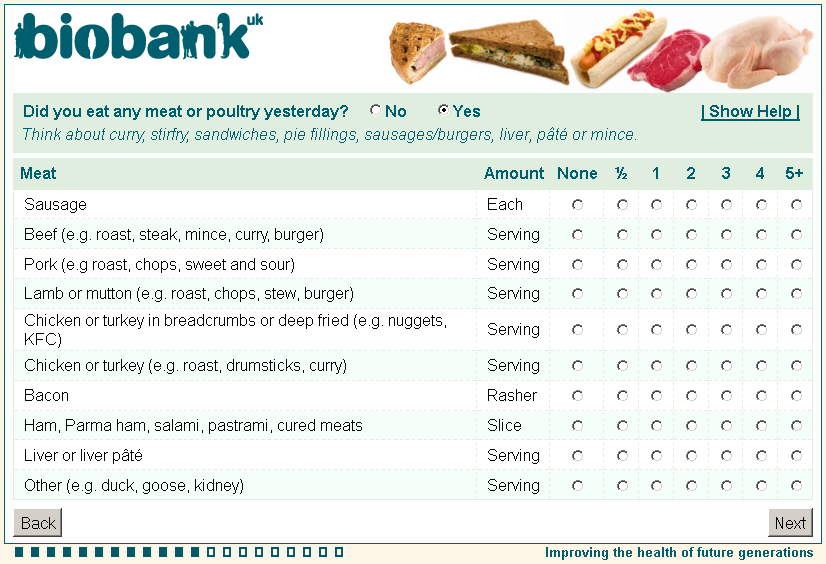 Online diet questionnaire screenshot wd0029, showing appearance as seen by participants using a web browser circa 2011.
