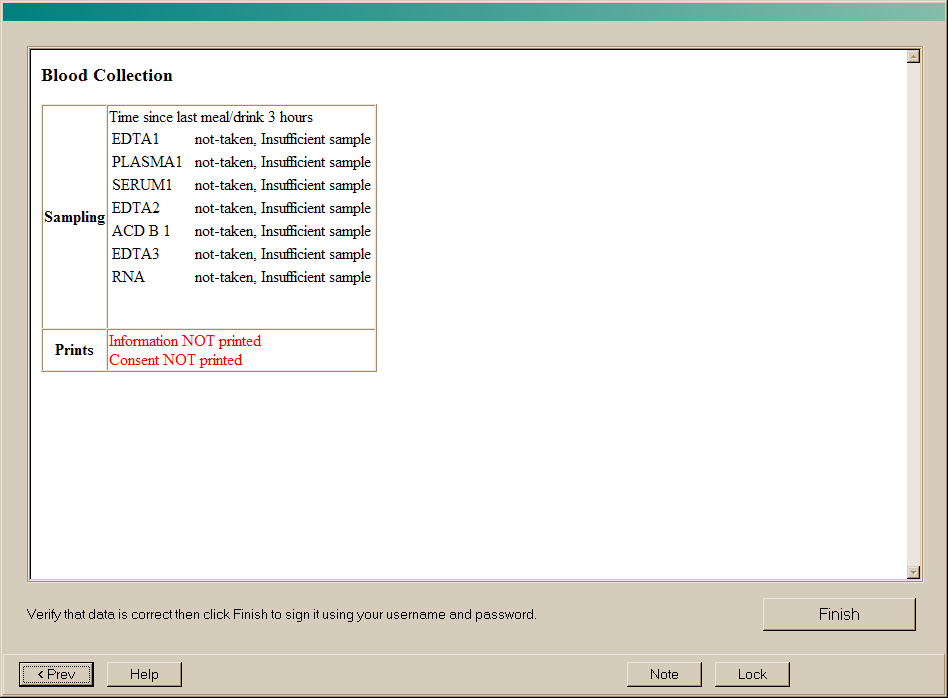 Screenshot showing confirmation of blood sampling for staff sign-off