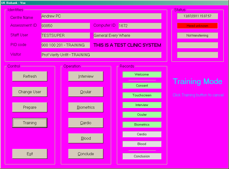 Screenshot showing main screen in training mode (indicated by text and fuchsia colour)