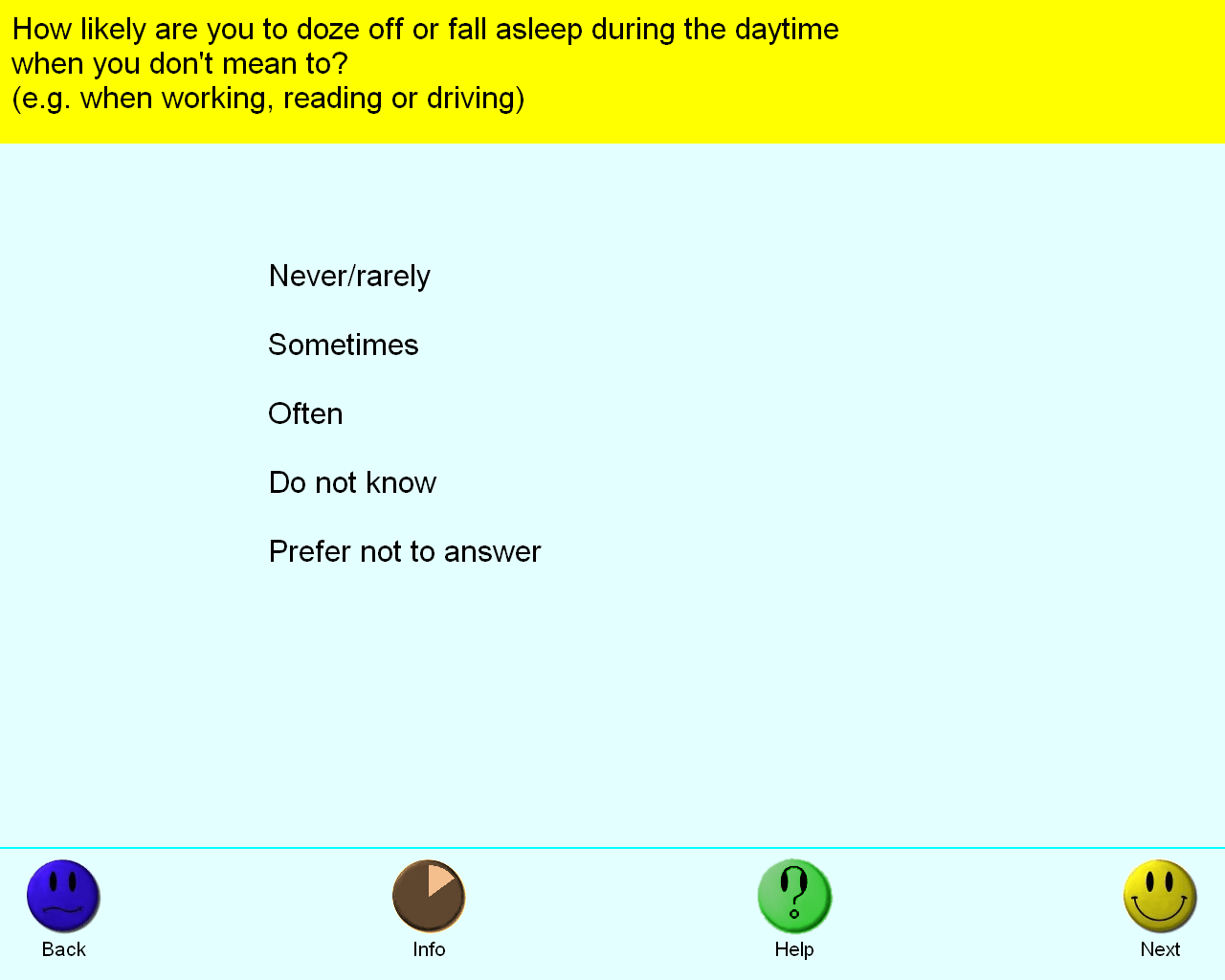 Screenshot of touchscreen questionnaire used to capture field 1220 in the UK Biobank Assessment Centres using the ACE system.