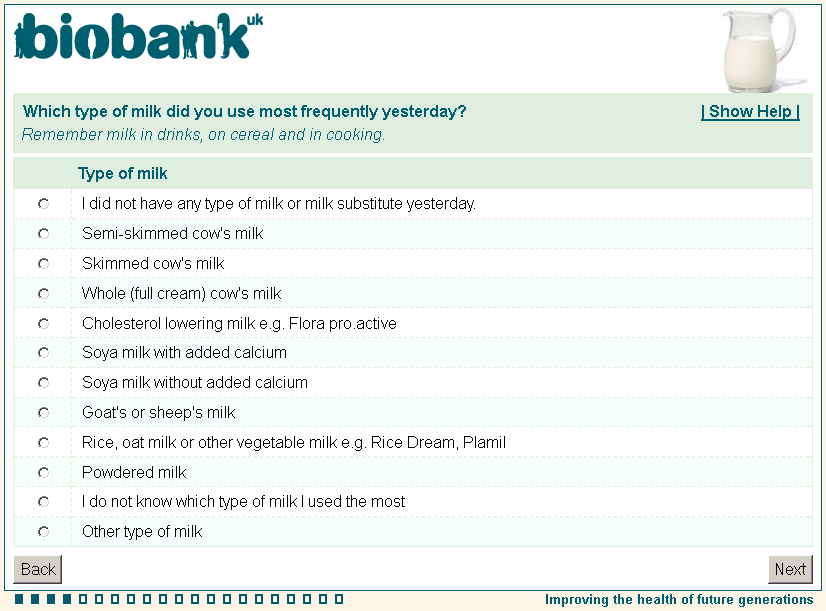 Online diet questionnaire screenshot wd0010, showing appearance as seen by participants using a web browser circa 2011.