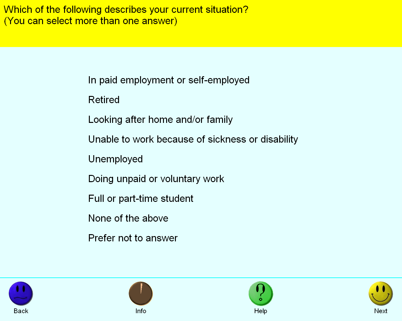 Screenshot of touchscreen questionnaire used to capture field 6142 in the UK Biobank Assessment Centres using the ACE system.