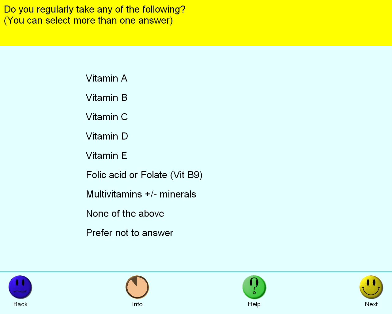 Screenshot of touchscreen questionnaire used to capture field 6155 in the UK Biobank Assessment Centres using the ACE system.