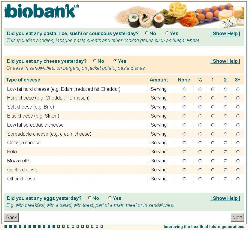 Online diet questionnaire screenshot wd0102, showing appearance as seen by participants using a web browser circa 2011.