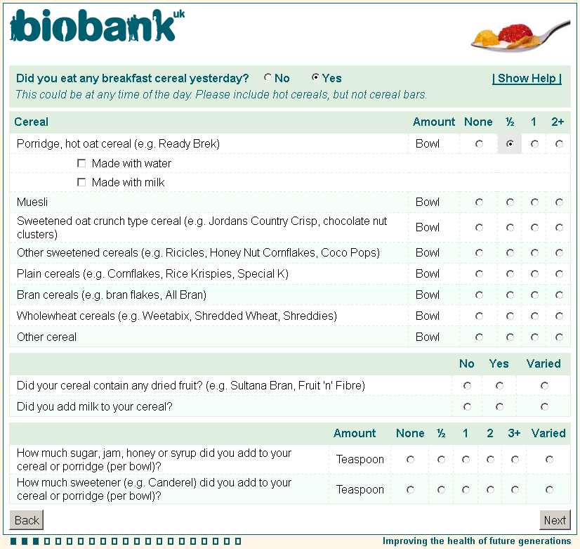 Online diet questionnaire screenshot wd0009, showing appearance as seen by participants using a web browser circa 2011.