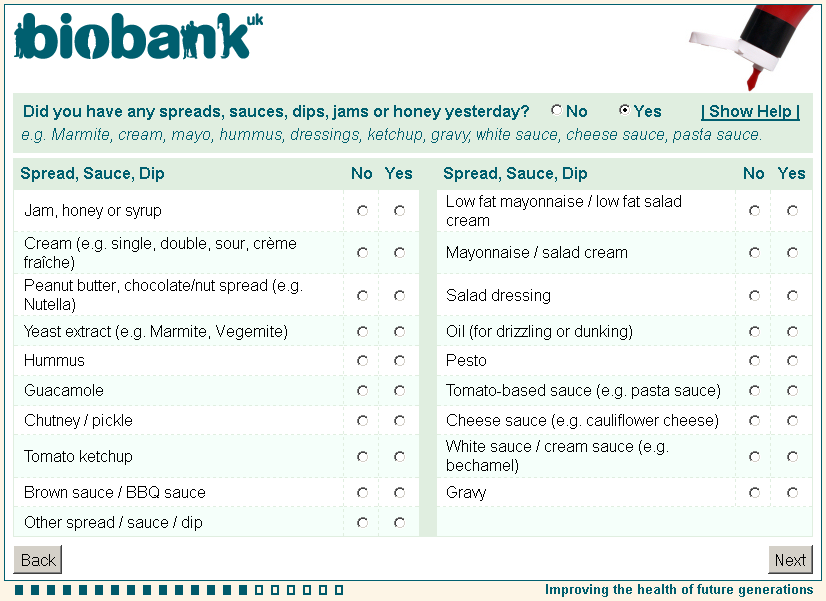 Online diet questionnaire screenshot wd0038, showing appearance as seen by participants using a web browser circa 2011.