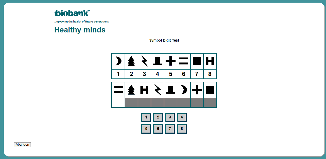 This illustrates the symbol digit test. Participants were shown a series of similar screens until the time limit expired.