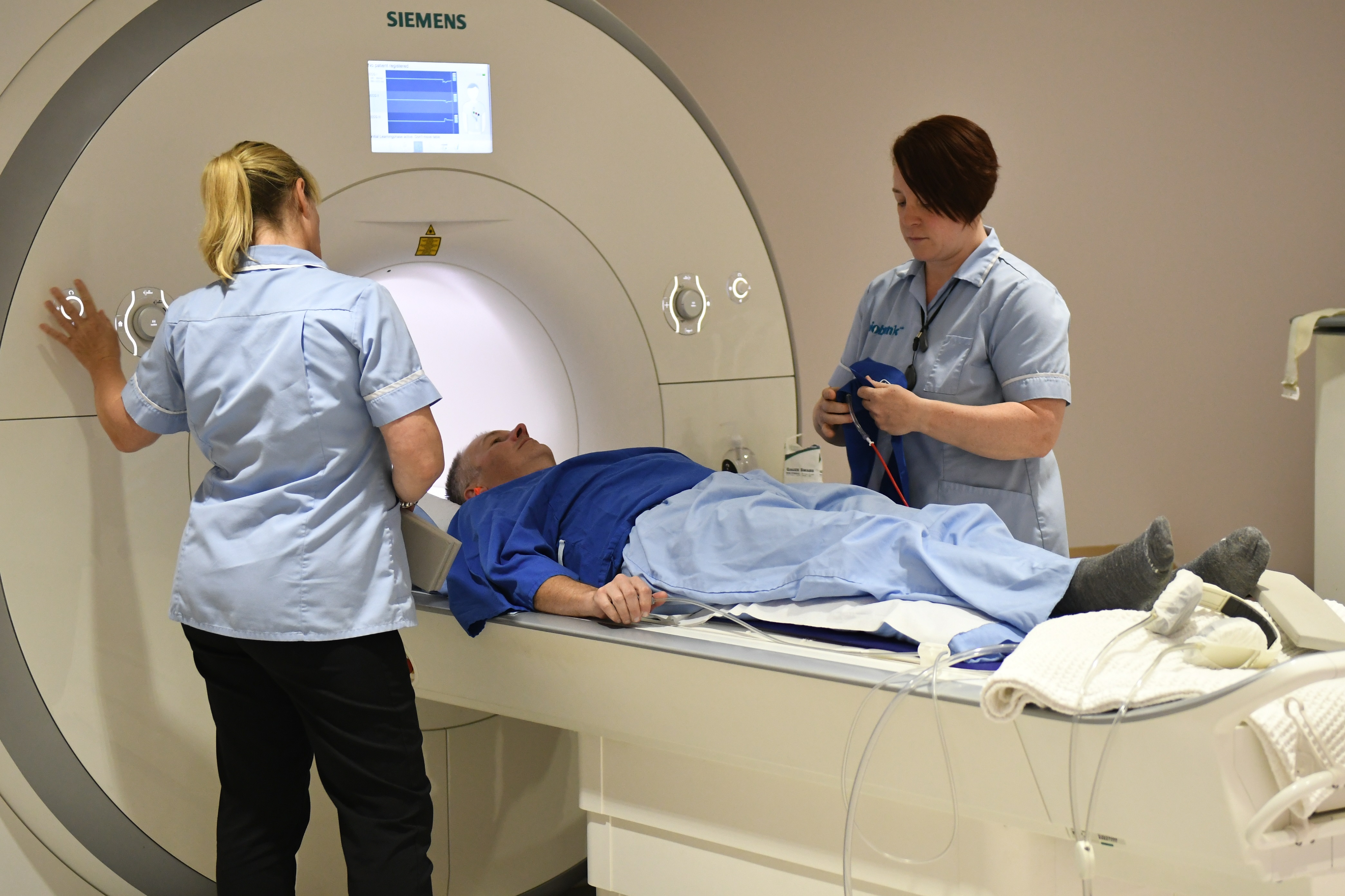 Shows a participant being prepared for the chest MRI examination. The staff member on the right is about to fit a blood-pressure cuff to the participants left arm.