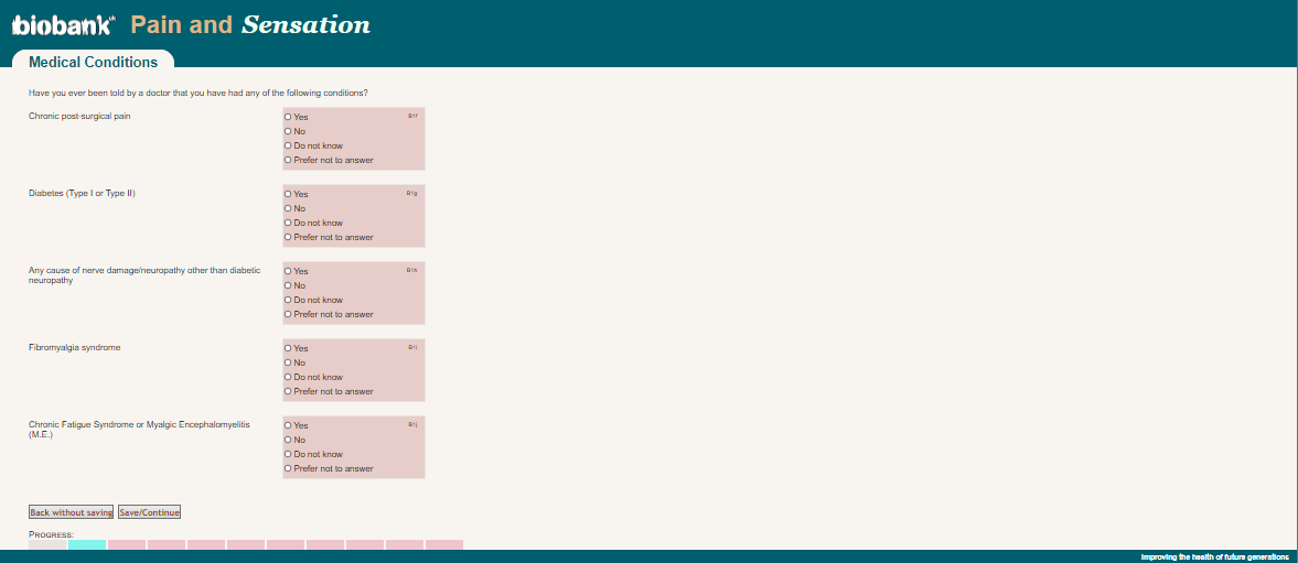 Online pain questionnaire screenshot of questions B1f-B1j, showing appearance as seen by participants circa 2019.