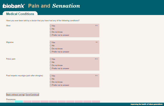 Online pain questionnaire screenshot of questions B1k-B1n, showing appearance as seen by participants circa 2019.