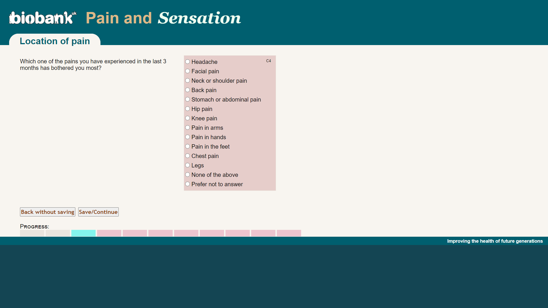Online pain questionnaire screenshot of question C4, showing appearance as seen by participants circa 2019.