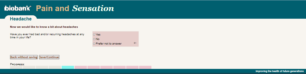 Online pain questionnaire screenshot of question E1, showing appearance as seen by participants circa 2019.